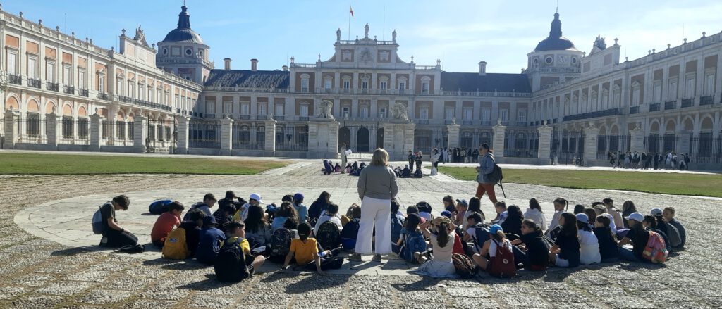 La primera parada la realizamos en frente de la fachada principal del Palacio de Aranjuez, a orillas del río Tajo, explicación de la realización, arquitectos, materiales, y posteriores ampliaciones que sufre el edificio, según va siendo habitada por los distintos reyes que utilización este maravilloso emplazamiento.